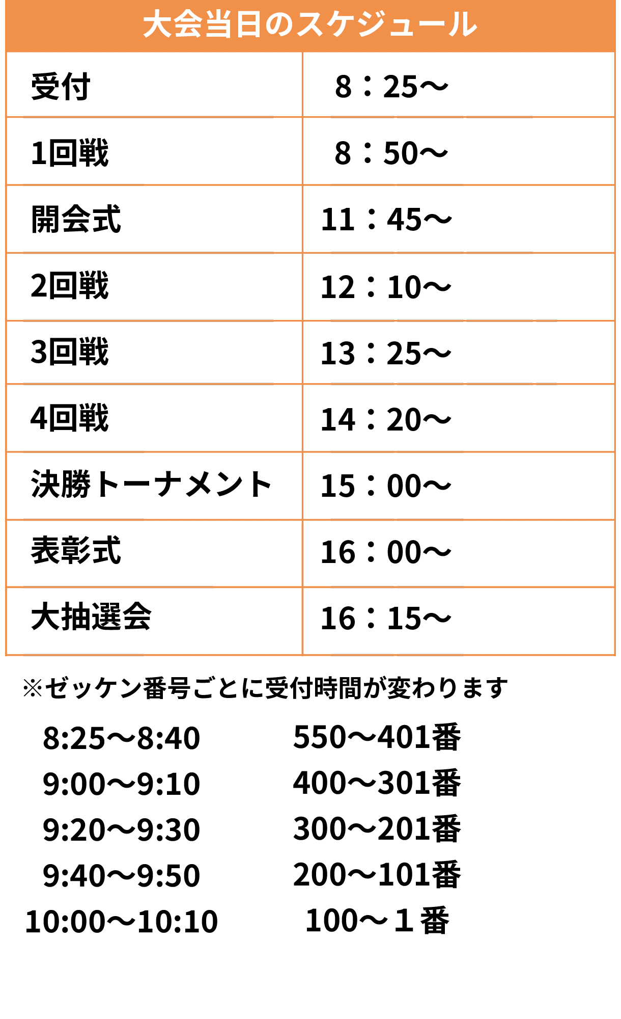 A.1回戦は集合時間がゼッケンごとに異なります。エントリーカードに書いてありますのでご確認ください。都度会場でアナウンスいたしますのでご確認ください。
