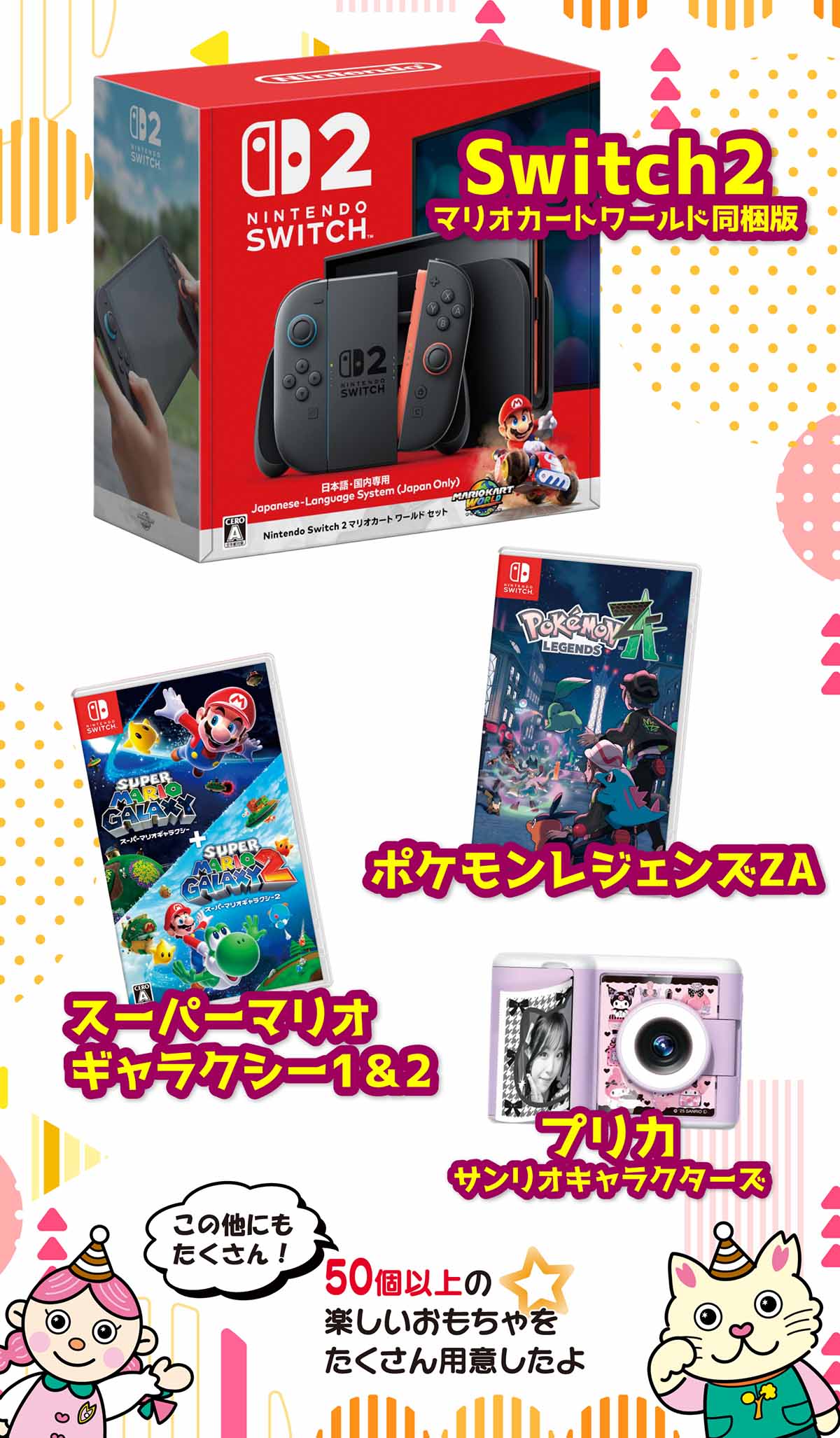 子供に人気のおもちゃやゲームを中心に、50個以上を用意。